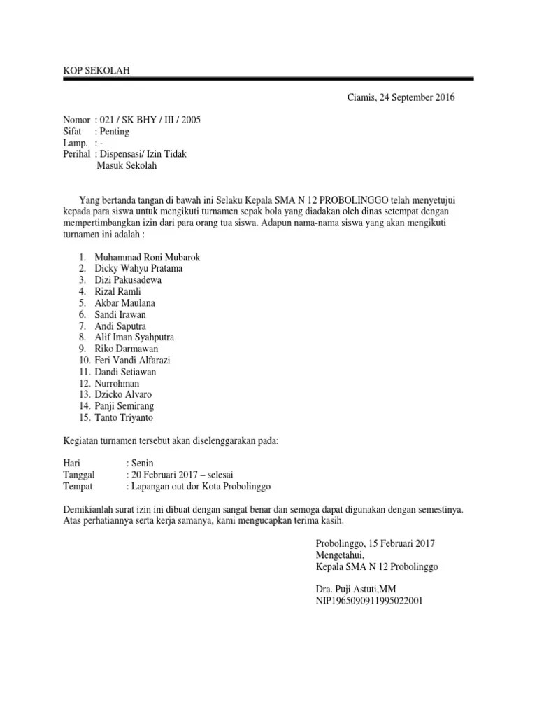 Contoh Surat Izin Dispensasi Atlet - Terlampir bersama surat ini, untuk diberikan dispensasi (izin tidak .. Biasanya surat ini akan diberikan seseorang ketika harus izin di pertengahan jam kerja atau sekolah. Terlampir bersama surat ini, untuk diberikan dispensasi (izin tidak . Daftar nama atlet dan official bola voli indoor putri banyumas no 1 2 3 4 5 6 7 . Recommended · surat dispensasi nur adli · conto surat dispensasi · contoh surat peminjaman · surat peminjaman tempat mubes. Buat kamu yang sedang menempuh pendidikan di jenjang perguruan tingi, .